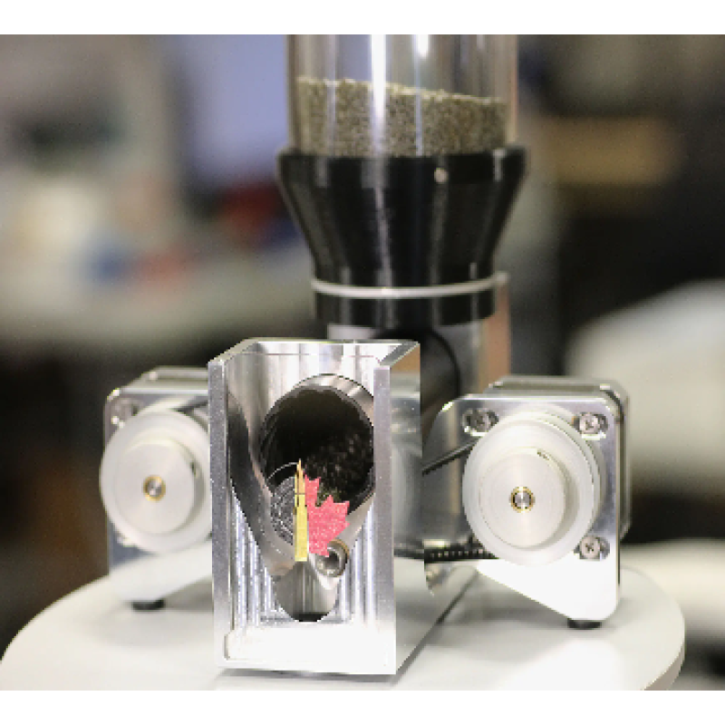 Inspired by an auger (and refined through simulation, testing, and iteration), a large tube with deep spiral grooves pours bulk powder at rates up to 50 GN/s, ramping down smoothly to within 1-2 grains of the target.