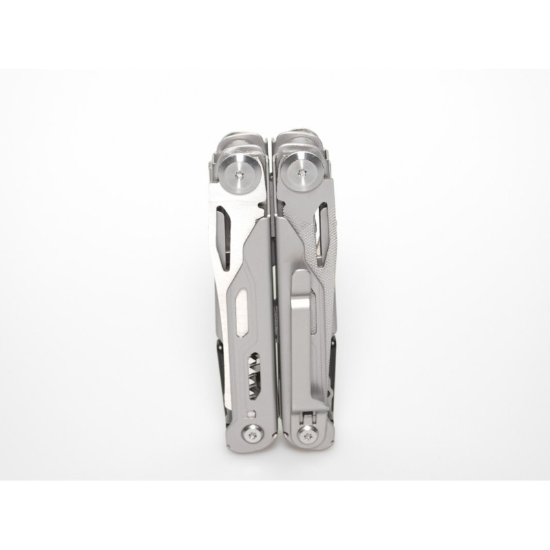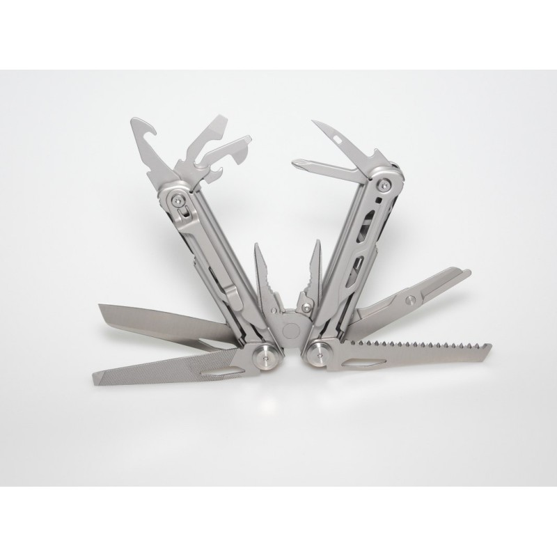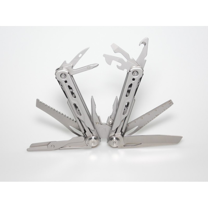 440 Stainless (Blade/Scissors ) 420 Stainless (Handle:420 Stainless 1.Needlenose Pliers 2.Regular Pliers 3.Wire Cutter 4.Blade 5.Scissors 6.Multipurpose Cutter 7.Bottle Opener With Flat Screwdriver 8.Can Opener With Flat Screwdriver 9.Phillips Screwdriver 10.Reamer 11.Metal File 12.Ruler 13.Saw 14.Wire Stripper 15.Belt Clip)