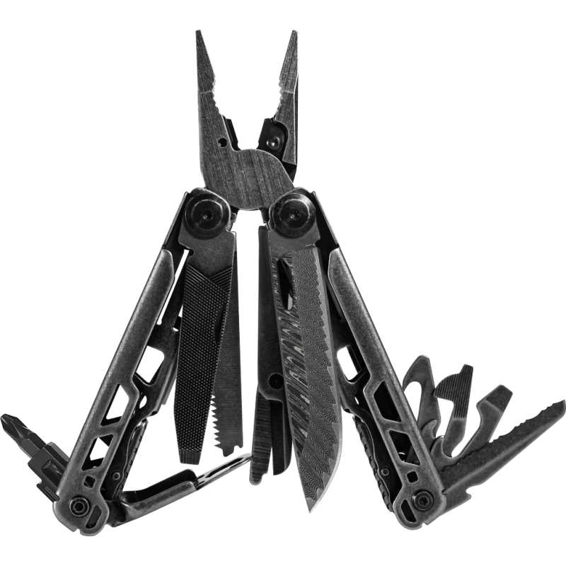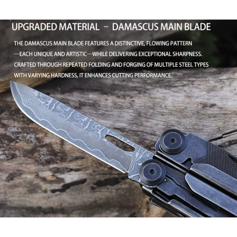 Stainless Steel, Full Locking Multitool Pliers Multi Tool Multi-function Tool with Belt Clip, featuring a Damascus blade and a unmistakenly battle worn look. |