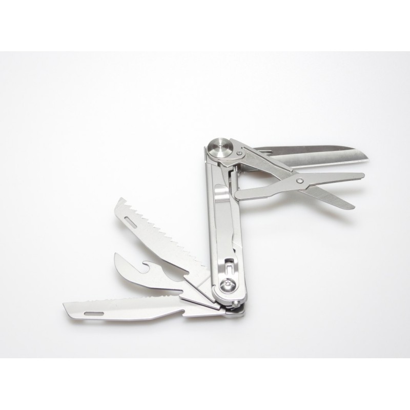 1. Can opener 2.Scissors 3. Knife 4. Saw 5. Serrated 6. Nail lifter 7. Bottle/Can opener 8. Window Smasher